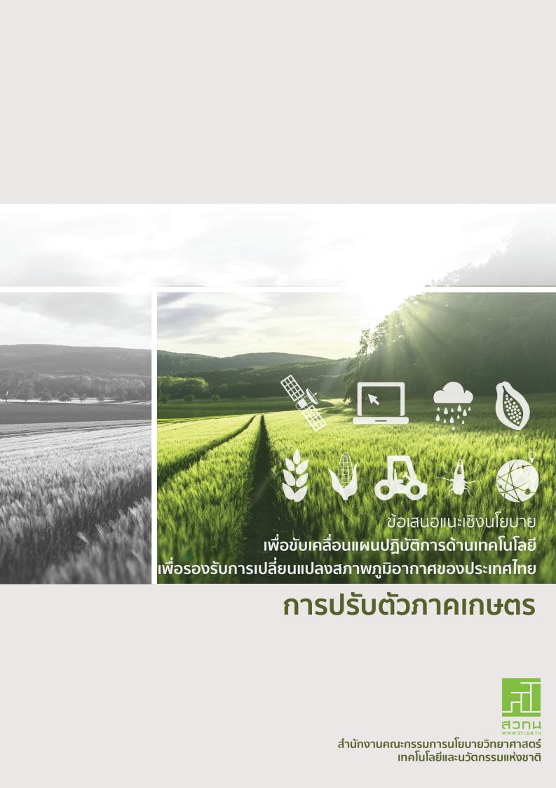 ข้อเสนอแนะเชิงนโยบายเพื่อขับเคลื่อนแผนปฏิบัติการด้านเทคโนโลยีเพื่อรองรับการเปลี่ยนแปลงสภาพภูมิอากาศของประเทศไทย : การปรับตัวภาคเกษตร จัดทำโดยสำนักงานคณะกรรมการนโยบายวิทยาศาสตร์ เทคโนโลยี และนวัตกรรมแห่งชาติ นำเสนอเกี่ยวกับการดำเนินการที่ต่อเนื่องจาก “โครงการการประเมินความต้องการเทคโนโลยีเพื่อรองรับกาเปลี่ยนแปลงสภาพภูมิอากาศของประเทศไทย (Technology Needs Assesment : TNA)” และ “โครงการจัดทำแผนปฏิบัติการด้านเทคโนโลยีเพื่อรองรับการเปลี่ยนแปลงสภาพภูมิอากาศของประเทศไทย: การปรับตัวภาคการเกษตร (Technology Action Plan : TAP)” โดยมีวัตถุประสงค์เพื่อคัดเลือกประเด็นสำคัญจากแผนปฏิบัติการฯ มาศึกษาในรายละเอียดและวิเคราะห์บริบทในการขับเคลื่อน รวมทั้งเสนอแนะแนวทางการพัฒนาและการถ่ายทอดเทคโนโลยีเป้าหมาย ตลอดจนนำเสนอโครงการรนำร่องที่พร้อมนำไปปฏิบัติได้จริง