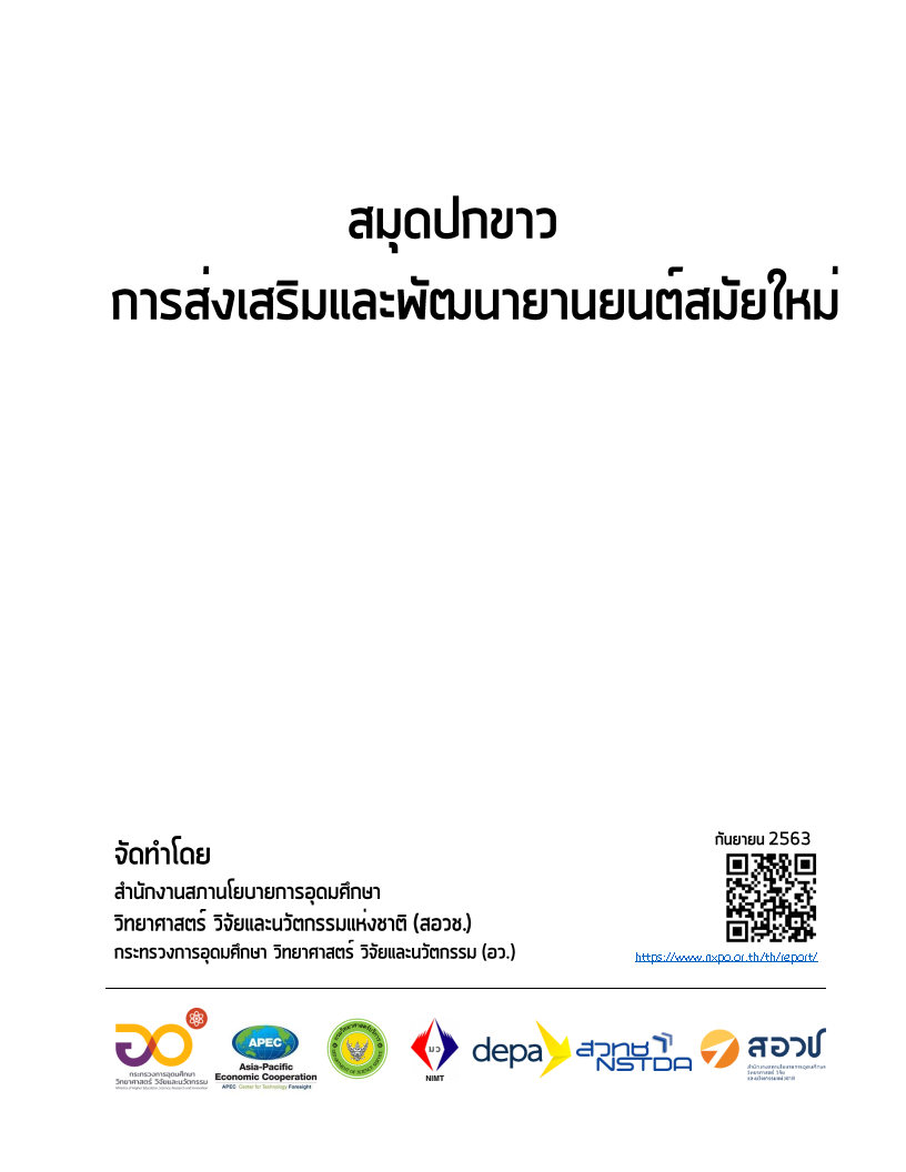 สมุดปกขาว การส่งเสริมและพัฒนายานยนต์สมัยใหม่ (Next-Generation Automotive : Promotion and Development) จัดทำโดยสภานโยบายการอุดมศึกษา วิทยาศาสตร์ วิจัยและนวัตกรรมแห่งชาติ โดยรวบรวมข้อคิดเห็นและข้อเสนอแนะจากการศึกษาข้อมูลในประเทศไทยและกรณีศึกษาจากต่างประเทศ เกี่ยวกับมลพิษจากการคมนาคม เพื่อเป็นแนวทางการพัฒนาอุตสาหกรรมยานยนต์อย่างบูรณาการเพื่อตอบโจทย์การพัฒนามาตรการและข้อเสนอแนะเชิงนโยบาย เพื่อแก้ไขปัญหามลพิษทางอากาศ (CO2 และ PM 2.5) จากการคมนาคม และการเพิ่มความปลอดภัยบนท้องถนนในประเทศไทย ในอีก 15 ปี ซึ่งจะนำไปสู่การพัฒนาอุตสาหกรรมยานยนต์สมัยใหม่ ( Next-Generation Automotive) และยานยนต์ที่ปล่อยมลพิษเป็นศูนย์ (Zero Emission Vehicle : ZEV) และอุตสาหกรรมที่เกี่ยวเนื่องด้านยานยนต์ขับขี่แบบอัตโนมัติ การเชื่อมต่อ การปรับให้เป็นระบบไฟฟ้า และการแบ่งปันกันใช้งาน (Autonomous, Connected, Electric, and Shared Vehicles : ACES)