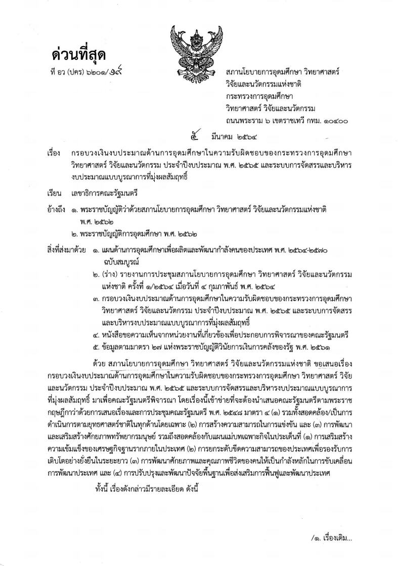 หนังสือราชการที่ อว(ปคร)6201/19 ลงวันที่ 5 มีนาคม 2564 กล่าวถึง กระทรวงการอุดมศึกษา วิทยาศาสตร์ วิจัยและนวัตกรรม เสนอต่อคณะรัฐมนตรี เกี่ยวกับกรอบวงเงินงบประมาณด้านการอุดมศึกษาในความรับผิดชอบของกระทรวงการอุดมศึกษาวิทยาศาสตร์ วิจัยและนวัตกรรม ประจำปีงบประมาณ พ.ศ. 2565 และระบบการจัดสรรและบริหารงบประมาณแบบบูรณาการที่มุ่งผลสัมฤทธิ์ โดย คณะรัฐมนตรีมีมติ 1. อนุมัติกรอบวงเงินงบประมาณด้านการอุดมศึกษาในความรับผิดชอบของกระทรวงการอุดมศึกษา วิทยาศาสตร์ วิจัยและนวัตกรรม ประจำปีงบประมาณ พ.ศ. 2565 จำนวน 117,880.9139 ล้านบาท และระบบการจัดสรรและบริหารงบประมาณแบบบูรณาการที่มุ่งผลสัมฤทธิ์ โดยยกเว้นการปฏิบัติตามมติคณะรัฐมนตรีเมื่อวันที่ 12 ตุลาคม 2563 (เรื่อง แนวทางการจัดทำงบประมาณและปฏิทินงบประมาณรายจ่าย ประจำปีงบประมาณ พ.ศ. 2565) ตามที่สภานโยบายการอุดมศึกษา วิทยาศาสตร์ วิจัยและนวัตกรรมแห่งชาติเสนอ ทั้งนี้ ให้กระทรวงการอุดมศึกษา วิทยาศาสตร์ วิจัยและนวัตกรรมรับความเห็นของสำนักงานสภาพัฒนาการเศรษฐกิจและสังคมแห่งชาติและข้อเสนอแนะของสำนักงาน ก.พ.ร. ที่เห็นควรกำหนดตัวชี้วัดเชิงผลลัพธ์ของการพลิกโฉมระบบอุดมศึกษาของประเทศไทย (Reinventing University System) ให้มีความท้าทาย เพื่อกระตุ้นให้เกิดการขับเคลื่อนแผนด้านการอุดมศึกษา เพื่อผลิตและพัฒนากำลังคนของประเทศ พ.ศ. 2564-2570 ไปสู่ความเป็นเลิศด้านการอุดมศึกษาของประเทศ เช่น ระดับความสำเร็จของสถาบันอุดมศึกษาที่ติดอันดับ World University Rankings by Subject หรือ World Class University Ranking ใน 100 อันดับแรก เป็นต้น และกำหนดเป้าหมายการจัดการศึกษา ในช่วงปีการศึกษา พ.ศ. 2564-2570 ให้รองรับอุตสาหกรรมเป้าหมายและอุปสงค์ของภาคการผลิต (Demand Side Financing) รวมทั้งบรรเทาผลกระทบต่อการจ้างงานที่เกิดจากการแพร่ระบาดของโรคติดเชื้อไวรัสโคโรนา 2019 (Covid-19) โดยเพิ่มเป้าหมายการผลิตบัณฑิต (Degree Program) ในสาขาวิชาที่สอดคล้องต่อการตอบสนองทิศทางการพัฒนาประเทศ มุ่งเน้นกลุ่มสาขาตามอุตสาหกรรมเดิมที่มีศักยภาพ (S-Curve) และอุตสาหกรรมอนาคต (New S-Curve) โดยเฉพาะอย่างยิ่งสาขาเทคโนโลยีดิจิทัล 2. ในการเสนอกรอบวงเงินงบประมาณประจำปีในคราวต่อ ๆ ไป ให้สภานโยบายการอุดมศึกษา วิทยาศาสตร์ วิจัยและนวัตกรรมแห่งชาตินำกรอบวงเงินงบประมาณด้านการอุดมศึกษาในความรับผิดชอบของกระทรวงการอุดมศึกษา วิทยาศาสตร์ วิจัยและนวัตกรรมและกรอบวงเงินงบประมาณด้านวิทยาศาสตร์ วิจัยและนวัตกรรมของประเทศเสนอต่อคณะรัฐมนตรีพิจารณาในคราวเดียวกันด้วย