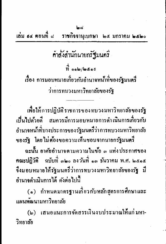ราชกิจจานุเบกษา เล่ม 94 ตอนที่ 8 หน้า 28-29 เรื่องคำสั่งสำนักนายกรัฐมนตรี ที่ 112/2519 เรื่อง การมอบหมายเกี่ยวกับอำนาจหน้าที่ของรัฐมนตรีว่าการทบวงมหาวิทยาลัยของรัฐ