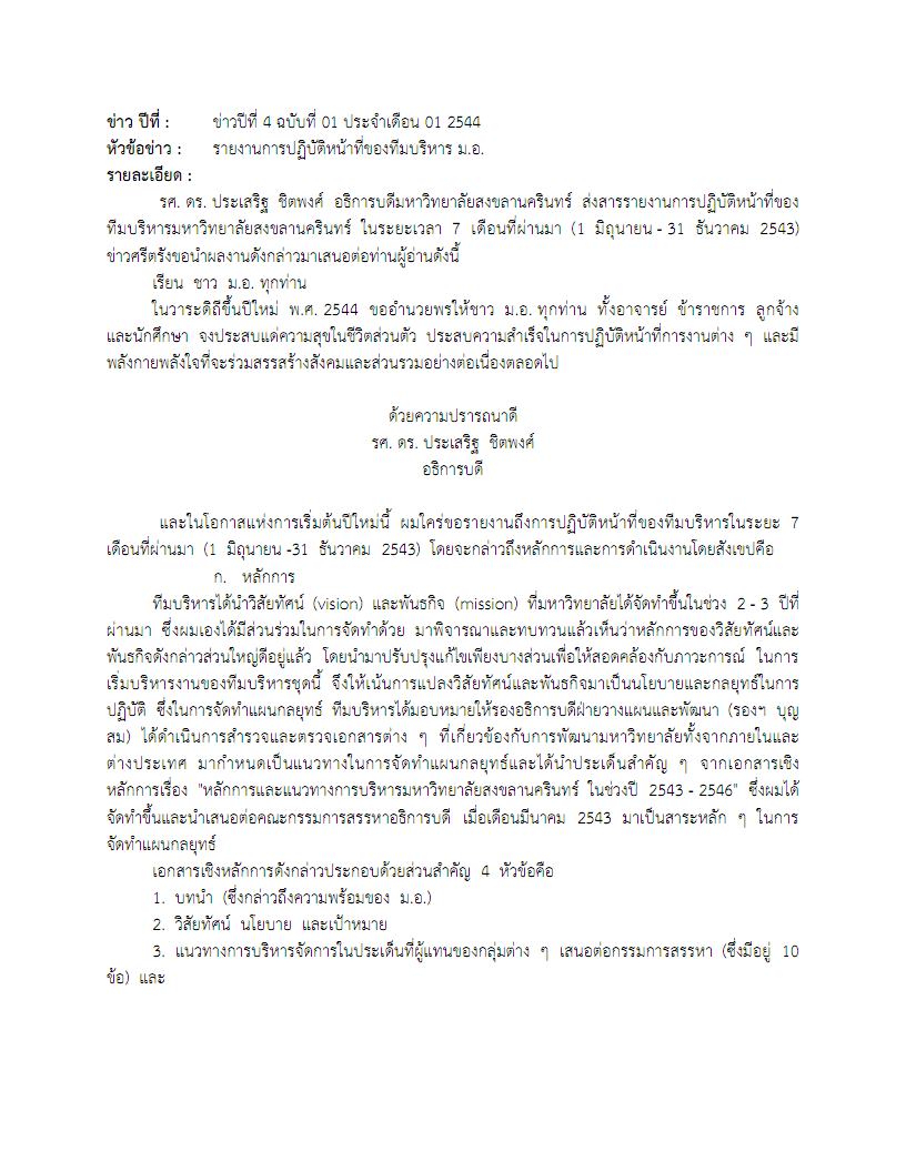 ข่าวปีที่ 4 ฉบับที่ 01 ประจำเดือน 01 พ.ศ. 2544 เกี่ยวกับรายงานการปฏิบัติหน้าที่ของทีมบริหาร ม.อ. ในระยะเวลา 7 เดือนที่ผ่านมา (1 มิถุนายน - 31 ธันวาคม 2543)
