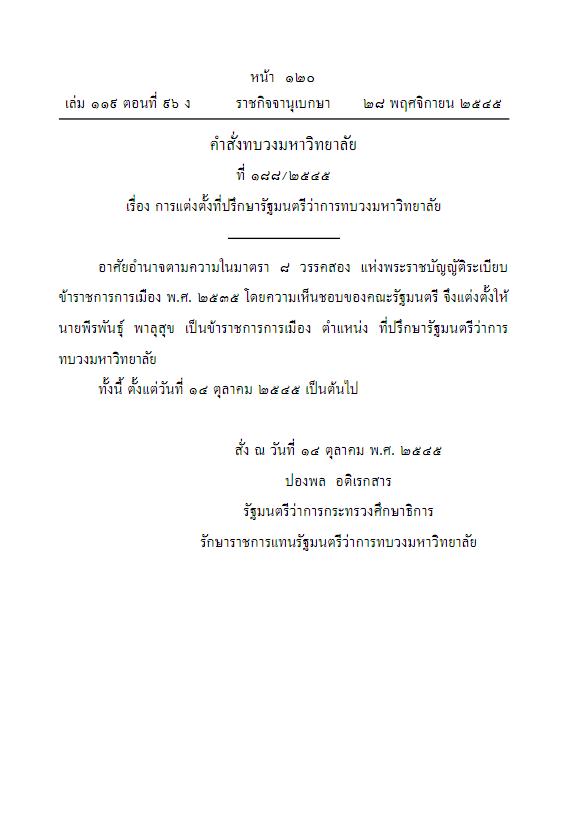 คำสั่งทบวงมหาวิทยาลัย ที่ 188/2545 เรื่อง การแต่งตั้งที่ปรึกษารัฐมนตรีว่าการทบวงมหาวิทยาลัย : นายพีรพันธุ์ พาลุสุข