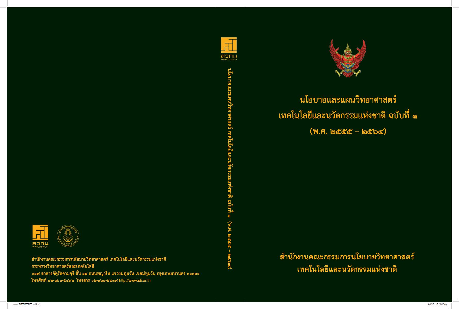 นโยบายและแผนวิทยาศาสตร์ เทคโนโลยี และนวัตกรรมแห่งชาติ ฉบับที่ 1 (พ.ศ. 2555-2564) ฉบับย่อ จัดทำโดยสำนักงานคณะกรรมการนโยบายวิทยาศาสตร์ เทคโนโลยี และนวัตกรรมแห่งชาติ มีวัตถุประสงค์เพื่อการพัฒนาประเทศไทยให้มีระบบเศรษฐกิจที่มีการขยายตัวอย่างมีคุณภาพและมีเสถียรภาพ ตลอดจนมีการกระจายประโยชน์อย่างเป็นธรรมสู่สังคม ชุมชน ท้องถิ่น มีการนำปรัชญาของเศรษฐกิจพอเพียงมาเป็นปรัชญานำทางในการพัฒนาควบคู่ไปกับอนาคตของประเทศที่มีวิทยาศาสตร์ เทคโนโลยีและนวัตกรรมเป็นเครื่องมือช่วยพัฒนาประเทศไทย ซึ่งสอดรับกับทิศทางการพัฒนาประเทศของรัฐบาลที่ต้องการเห็นประเทศไทยสามารถแข่งขันได้อย่างยั่งยืน มีเศรษฐกิจชุมชนเข้มแข็งเป็นสังคมแห่งการเรียนรู้ และประชาชนมีคุณภาพชีวิตที่ดีขึ้น โดยได้กำหนดกรอบการพัฒนาของนโยบายและแผนฯ 5 ประการ คือ 1. พัฒนางานวิทยาศาสตร์ เทคโนโลยีและนวัตกรรมเพื่อสนับสนุนการสร้างสังคมคุณภาพที่มีภูมิคุ้มกัน 2. พัฒนางานวิทยาศาสตร์ เทคโนโลยีและนวัตกรรมเพื่อสนับสนุนการสร้างเศรษฐกิจให้มีคุณภาพเสถียรภาพโดยมีการเชื่อมโยงกับเศรษฐกิจโลกและภูมิ ภาค (Globalization and Regionalization) 3. พัฒนางานวิทยาศาสตร์ เทคโนโลยีและนวัตกรรมเพื่อรองรับการเปลี่ยนแปลงสภาพภูมิอากาศ (Climate Change) 4. พัฒนาและผลิตกำลังคนด้านวิทยาศาสตร์ เทคโนโลยีและนวัตกรรม เพื่อรองรับการเปลี่ยนแปลงประชากรศาสตร์ (Demographic Change) 5. พัฒนาปัจจัยสนับสนุนด้านโครงสร้างพื้นฐานวิทยาศาสตร์ เทคโนโลยีและนวัตกรรมเพื่อสนับสนุนการเพิ่มขีดความสามารถในการแข่งขันของประเทศ -