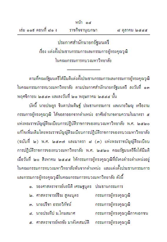 ราชกิจจานุเบกษา เล่ม 119 ตอนที่ 81 ง หน้า 14-15 เรื่อง แต่งตั้งประธานกรรมการและกรรมการผู้ทรงคุณวุฒิในคณะกรรมการทบวงมหาวิทยาลัย จำนวน 10 ราย -มีผลตั้งแต่ วันที่ 20 สิงหาคม 2545 ประกาศ ณ วันที่ 3 กันยายน 2545