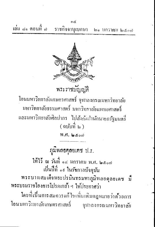 ราชกิจจานุเบกษา เล่ม 81 ตอนที่ 7 หน้า 14-16 เรื่องพระราชบัญญัติ โอนมหาวิทยาลัยเกษตรศาสตร์ จุฬาลงกรณมหาวิทยาลัย มหาวิทยาลัยธรรมศาสตร์ มหาวิทยาลัยแพทยศาสตร์ และมหาวิทยาลัยศิลปากร ไปสังกัดสำนักนายกรัฐมนตรี (ฉบับที่ 2 ) พ.ศ. 2507