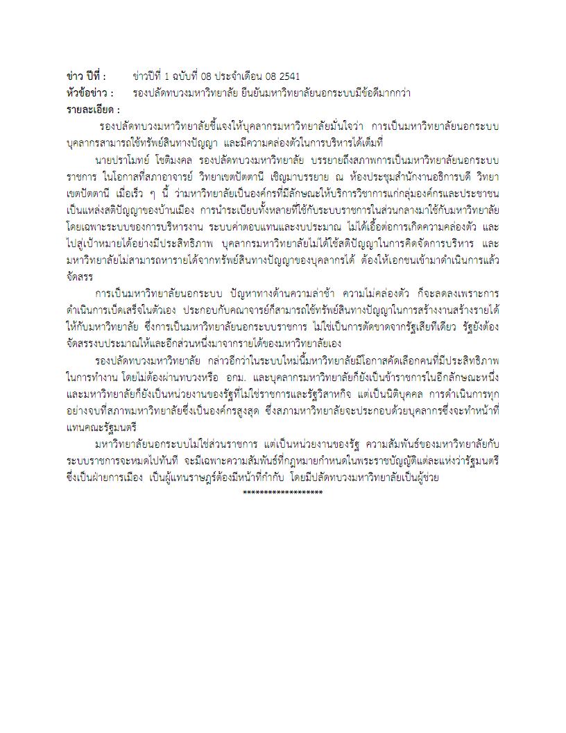 ข่าวปีที่ 1 ฉบับที่ 08 ประจำเดือน 08 พ.ศ. 2541 เกี่ยวกับการที่มหาวิทยาลัยนอกระบบมีข้อดีมากกว่า โดยรองปลัดทบวงมหาวิทยาลัยชี้แจงให้บุคลากรมหาวิทยาลัยมั่นใจว่า การเป็นมหาวิทยาลัยนอกระบบ บุคลากรสามารถใช้ทรัพย์สินทางปัญญา และมีความคล่องตัวในการบริหารได้เต็มที่ ซึ่งมหาวิทยาลัยนอกระบบไม่ใช่ส่วนราชการ แต่เป็นหน่วยงานของรัฐ ความสัมพันธ์ของมหาวิทยาลัยกับระบบราชการจะหมดไปทันที จะมีเฉพาะความสัมพันธ์ที่กฎหมายกำหนดในพระราชบัญญัติแต่ละแห่งว่ารัฐมนตรีซึ่งเป็นฝ่ายการเมือง เป็นผู้แทนราษฎร์ต้องมีหน้าที่กำกับ โดยมีปลัดทบวงมหาวิทยาลัยเป็นผู้ช่วย