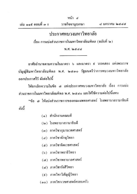 ราชกิจจานุเบกษา เล่ม 119 ตอนที่ 3 ง หน้า 4-5 เกี่ยวกับการแบ่งส่วนราชการในมหาวิทยาลัยมหิดล (ฉบับที่ 2) พ.ศ. 2544 ประกาศ ณ วันที่ 3 ธันวาคม 2544