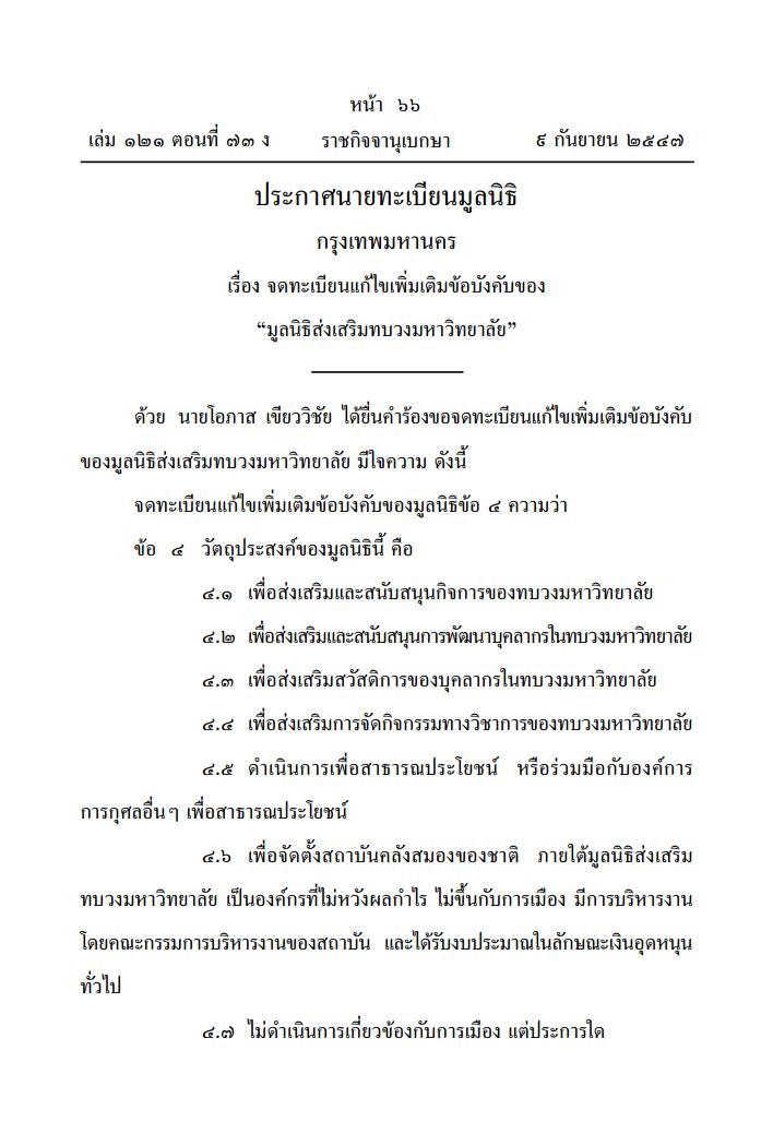 ราชกิจจานุเบกษา เล่ม 121 ตอนที่ 73 ง หน้า 66-67 เรื่องทะเบียนแก้ไขเพิ่มเติมข้อบังคับของ "มูลนิธิส่งเสริมทบวงมหาวิทยาลัย" ประกาศ ณ วันที่ 25 พฤษภาคม 2547