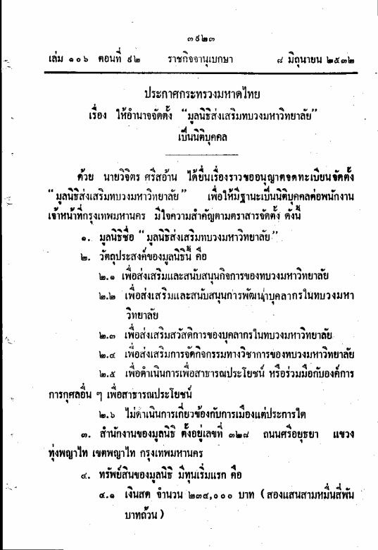 ราชกิจจานุเบกษา เล่ม 106 ตอนที่ 92 หน้า 3923-3924 เรื่องประกาศกระทรวงมหาดไทย เรื่อง ให้อำนาจจัดตั้ง "มูลนิธิส่งเสริมทบวงมหาวิทยาลัย" เป็นนิติบุคคล