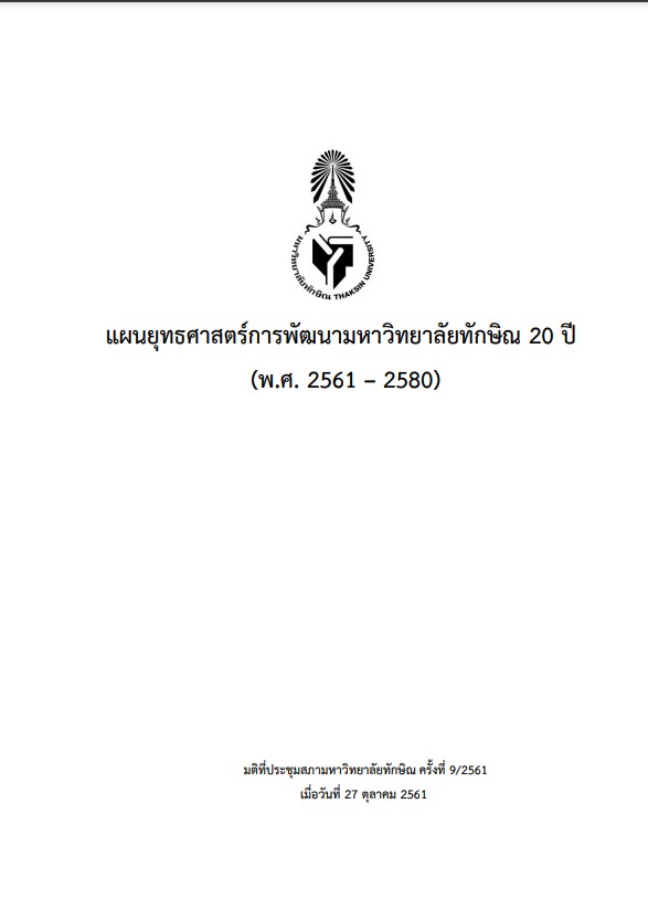 มหาวิทยาลัยทักษิณ ได้ทบทวน และปรับปรุงแผนยุทธศาสตร์การพัฒนามหาวิทยาลัย โดยจัดทำเป็นแผนยุทธศาสตร์การพัฒนามหาวิทยาลัยทักษิณ พ.ศ.2561-2580 (ระยะยาว 20 ปี) โดยกำหนดความท้าทายเชิงกลยุทธ์ ไว้ 5 ด้าน คือ 1. ความเป็นเลิศด้านการผลิตบัณฑิตที่ใช้ชุมชนเป็นฐาน 2. ความเข้มแข็งด้านการวิจัย 3. ความเป็นนานาชาติ 4. การบริหารจัดการเพื่อการดำเนินงานที่เป็นเลิศ และ 5. ความมั่นคงทางการเงิน และจากความท้าทายนี้ได้นำไปกำหนดวัตถุประสงค์ ตัวชี้วัดหลัก จากตัวชี้วัดหลักจึงกำหนดกลยุทธ์ และโครงการ/กิจกรรม -