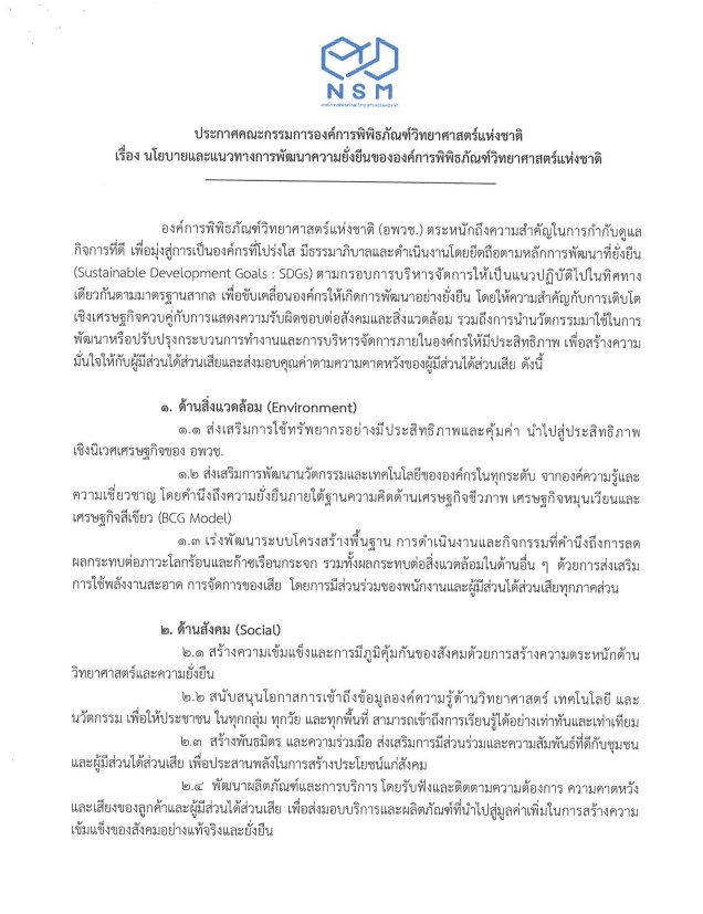 ประกาศคณะกรรมการองค์การพิพิธภัณฑ์วิทยาศาสตร์แห่งชาติ เรื่อง นโยบายและแนวทางการพัฒนาความยั่งยืนขององค์การพิพิธภัณฑ์วิทยาศาสตร์แห่งชาติ -