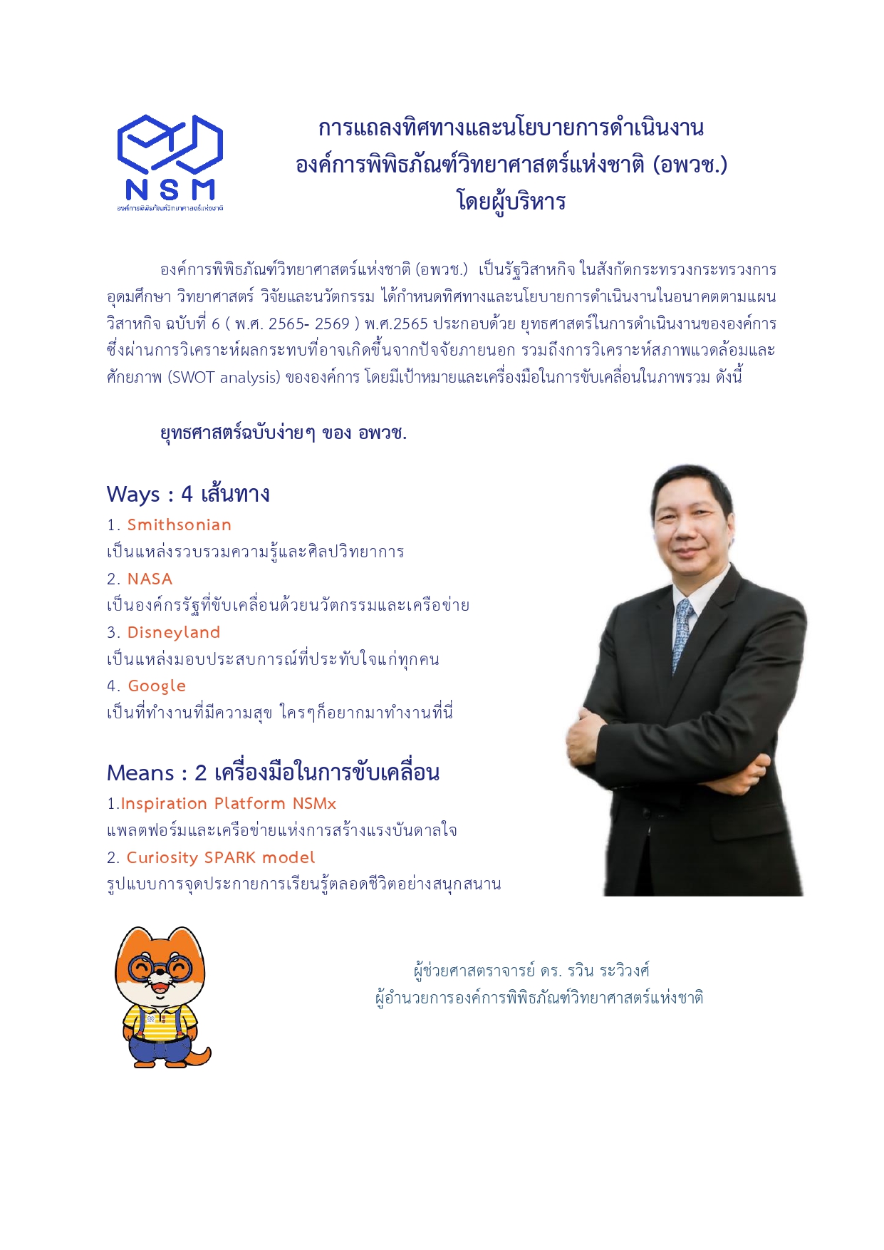 คำแถลงการณ์ของผู้ช่วยศาสตราจารย์ ดร.รวิน ระวิวงศ์ ในฐานะผู้อำนวยการองค์การพิพิธภัณฑ์วิทยาศาสตร์แห่งชาติ (อพวช.) -