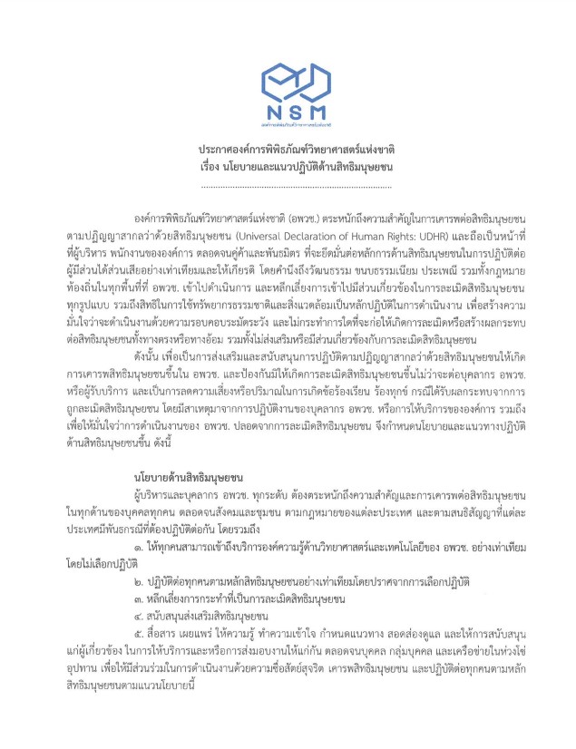 ประกาศองค์การพิพิธภัณฑ์วิทยาศาสตร์แห่งชาติ เรื่อง นโยบายและแนวปฏิบัติด้านสิทธิมนุษยชน เพื่อตระหนักถึงความสำคัญในการเคารพต่อสิทธิมนุษยชนตามปฏิญญาสากลว่าด้วยสิทธิมนุษยชน (Universal Declaration of Human Rights: UDHR) -