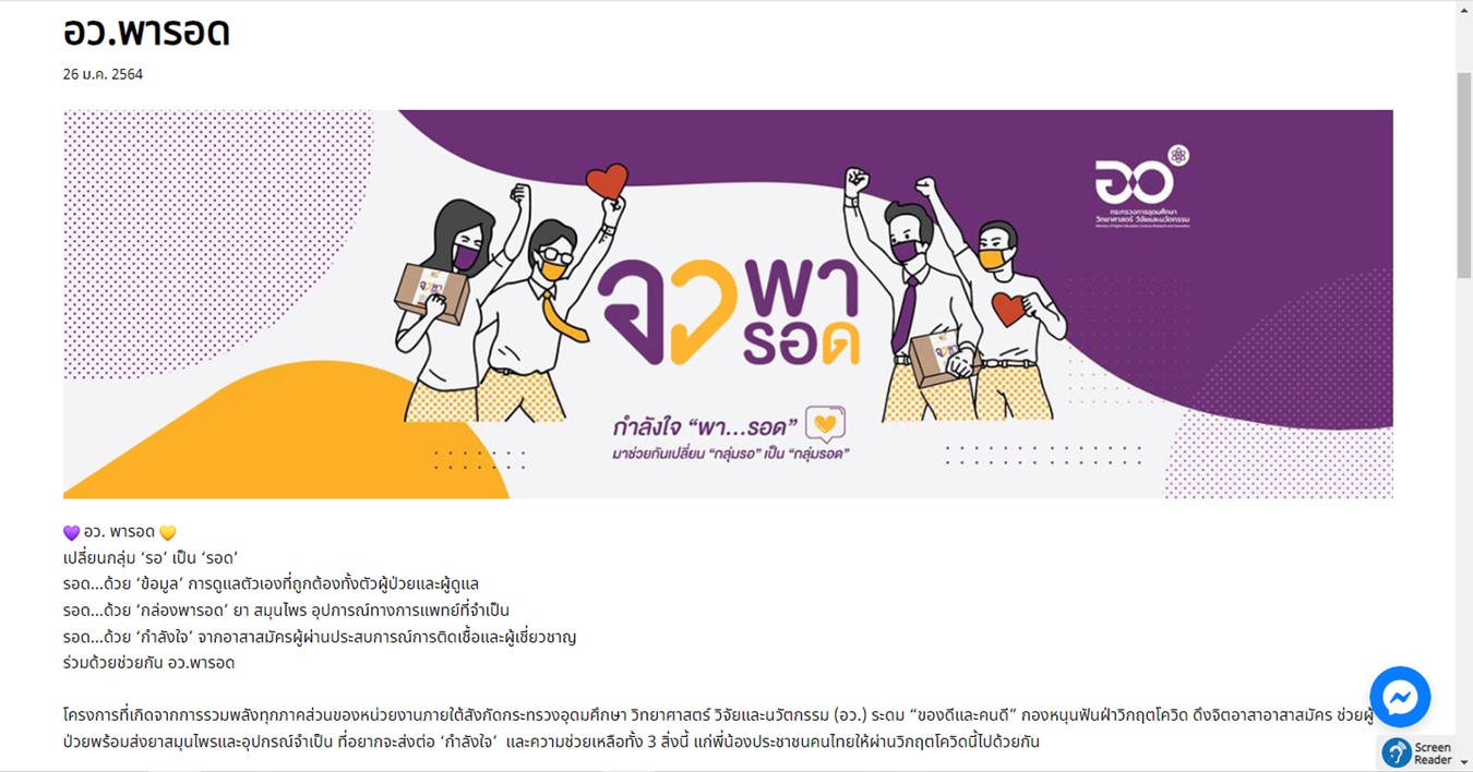 โครงการที่เกิดจากการรวมพลังทุกภาคส่วนของหน่วยงานภายใต้สังกัดกระทรวงอุดมศึกษา วิทยาศาสตร์ วิจัยและนวัตกรรม (อว.) ระดม “ของดีและคนดี” กองหนุนฟันฝ่าวิกฤตโควิด ดึงจิตอาสาอาสาสมัคร ช่วยผู้ป่วยพร้อมส่งยาสมุนไพรและอุปกรณ์จำเป็น ที่อยากจะส่งต่อ ‘กำลังใจ’ และความช่วยเหลือทั้ง 3 สิ่งนี้ แก่พี่น้องประชาชนคนไทยให้ผ่านวิกฤตโควิดนี้ไปด้วยกัน
