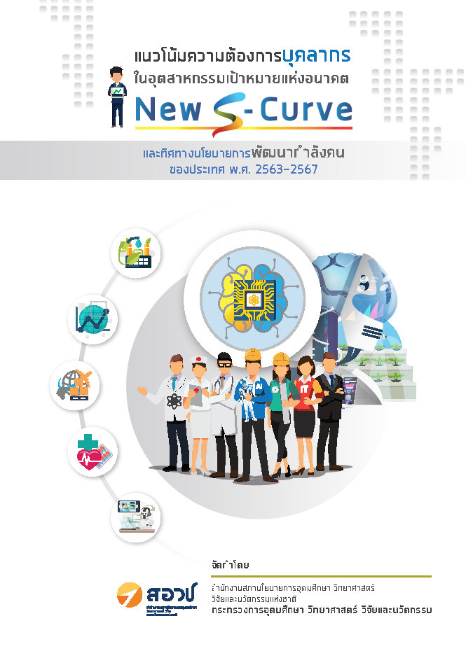 แนวโน้มความต้องการบุคลากรในอุตสาหกรรมเป้าหมายแห่งอนาคต New S-Curve และทิศทางนโยบายการพัฒนากำลังคนของประเทศ พ.ศ. 2563-2567 (Demand New S-Curve 2563-2567) จัดทำโดยสภานโยบายการอุดมศึกษา วิทยาศาสตร์ วิจัยและนวัตกรรมแห่งชาติ นำเสนอเกี่ยวกับการพัฒนาทรัพยากรมนุษย์ ที่มีสมรรถนะพร้อมกับการพัฒนาอุตสาหกรรม 5 กลุ่มสำคัญ เพื่อพัฒนาประเทศในอนาคต โดยรายงานนำเสนอรายละเอียด ดังนี้ 1. อุตสาหกรรมเชื้อเพลิงชีวภาพและเคมีชีวภาพ 2. อุตสาหกรรมดิจิทัล 3. อุตสาหกรรมการบินและโลจิสติกส์ 4. อุตสาหกรรมการแพทย์ครบวงจร 5. อุตสาหกรรมหุ่นยนต์ และ 6. ทิศทางนโยบายการพัฒนากำลังคนของประเทศ พ.ศ.2563-2567