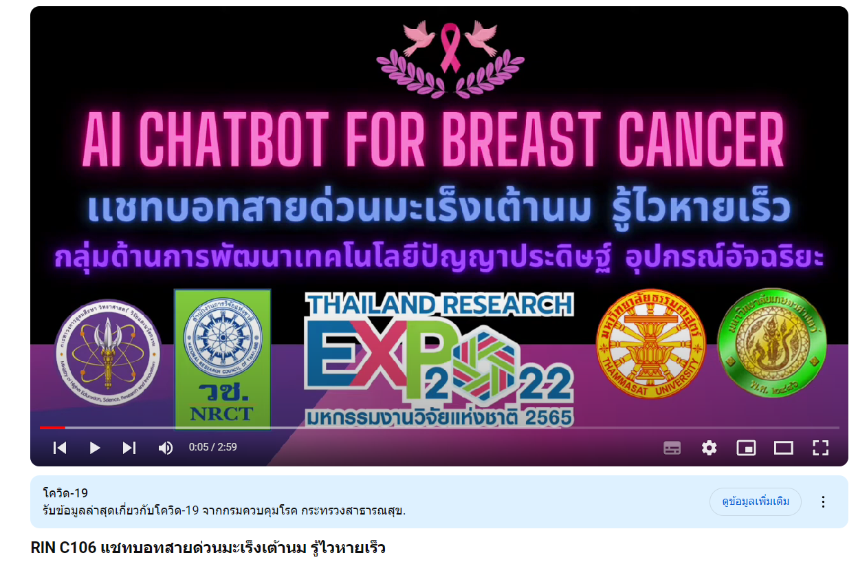 ผลงานสายนวัตกรรมอุดมศึกษา ประจำปี 2565 ด้านการพัฒนาเทคโนโลยี ปัญญาประดิษฐ์ อุปกรณ์อัจฉริยะ: แชทบอทสายด่วนมะเร็งเต้านม รู้ไวหายเร็ว