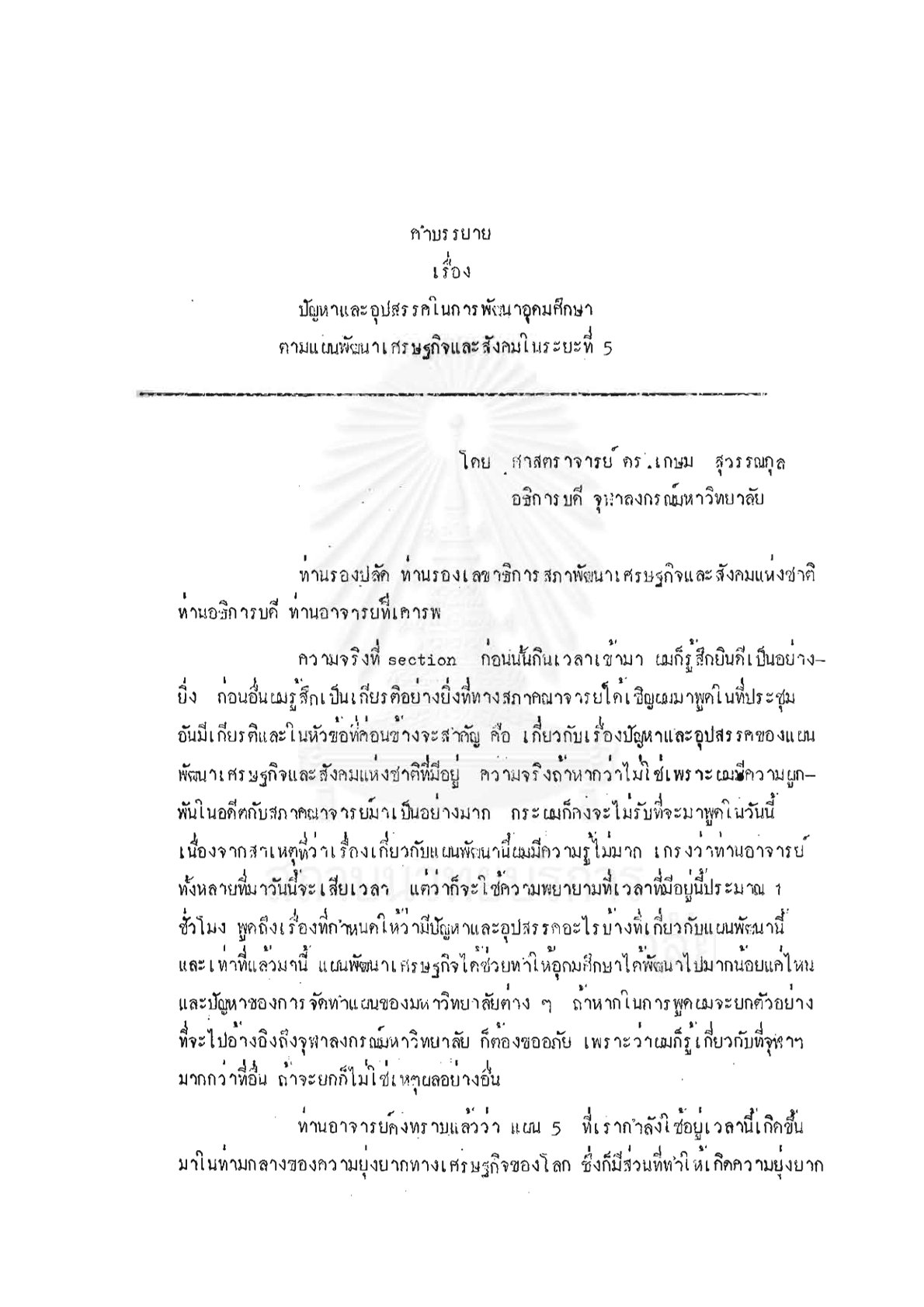 เอกสารนี้เป็นรายงานการสัมมนาทางวิชาการ เรื่อง มหาวิทยาลัยในแผนพัฒนาเศรษฐกิจและสังคมแห่งชาติระยะที่ 6 (พ.ศ.2530-2534) ณ โรงแรมลีการ์เดน หาดใหญ่ สงขลา วันที่ 5-6 ตุลาคม 2527 โดย ศาสตราจารย์ ดร. เกษม สุวรรณกุล อธิการบดี จุฬาลงกรณ์มหาวิทยาลัย