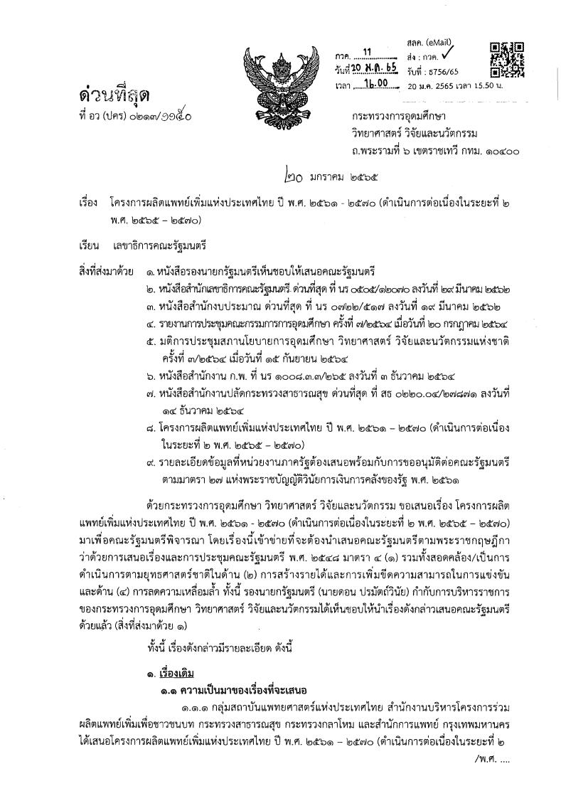 หนังสือราชการที่ อว(ปคร)0213/1150 ลงวันที่ 20 มกราคม 2565 กล่าวถึง กระทรวงการอุดมศึกษา วิทยาศาสตร์ วิจัยและนวัตกรรม เสนอต่อคณะรัฐมนตรี เกี่ยวกับโครงการผลิตแพทย์เพิ่มแห่งประเทศไทย ปี พ.ศ. 2561 – 2570 โดยคณะรัฐมนตรีมีมติ 1. เห็นชอบในหลักการโครงการผลิตแพทย์เพิ่มแห่งประเทศไทย ระยะที่ 2 (พ.ศ. 2565-2570) สำหรับค่าใช้จ่ายในการดำเนินโครงการ เห็นควรให้กระทรวงการอุดมศึกษา วิทยาศาสตร์ วิจัยและนวัตกรรมจัดทำแผนการปฏิบัติงานและแผนการใช้จ่ายงบประมาณ พร้อมทั้งรายละเอียดที่เกี่ยวข้อง เพื่อเสนอขอตั้งงบประมาณรายจ่ายประจำปีตามความพร้อม ความจำเป็น และความเหมาะสมที่จะต้องใช้จ่ายในแต่ละปีงบประมาณ ทั้งนี้ กระทรวงการอุดมศึกษา วิทยาศาสตร์ วิจัยและนวัตกรรมควรนำผลการติดตามและประเมินผลโครงการเพื่อใช้ประกอบการพิจารณาผลิตแพทย์ให้สอดคล้องกับสถานการณ์และความต้องการกำลังคนด้านสุขภาพของประเทศอย่างเป็นระบบ ตามความเห็นของสำนักงบประมาณ ทั้งนี้ ให้กระทรวงการอุดมศึกษา วิทยาศาสตร์ วิจัยและนวัตกรรมและหน่วยงานที่เกี่ยวข้องรับความเห็นของกระทรวงการคลัง และกระทรวงศึกษาธิการ รวมทั้งข้อสังเกตของสำนักงาน ก.พ. เช่น ควรมีการติดตามประเมินผลโครงการ วางแผนปรับปรุงหลักเกณฑ์และวิธีการคัดเลือกให้เหมาะสมและสอดคล้องกับวัตถุประสงค์ของโครงการ ประชาสัมพันธ์เกี่ยวกับการรับทุนของโครงการ และวางแผนการบรรจุและแต่งตั้งให้มีบุคลากรสาขาแพทย์ เป็นต้น 2. ให้กระทรวงสาธารณสุขรับความเห็นของสำนักงานสภาพัฒนาการเศรษฐกิจและสังคมแห่งชาติที่เห็นควรเร่งนำเทคโนโลยีการแพทย์ทางไกล (Telemedicine) มาใช้ในการบริการด้านสุขภาพ ควบคู่กับการธำรงแพทย์ให้อยู่ในพื้นที่ และเร่งรัดดำเนินการพัฒนาระบบข้อมูลแพทย์ รวมถึงระบบในการเชื่อมโยงข้อมูลระหว่างหน่วยงาน