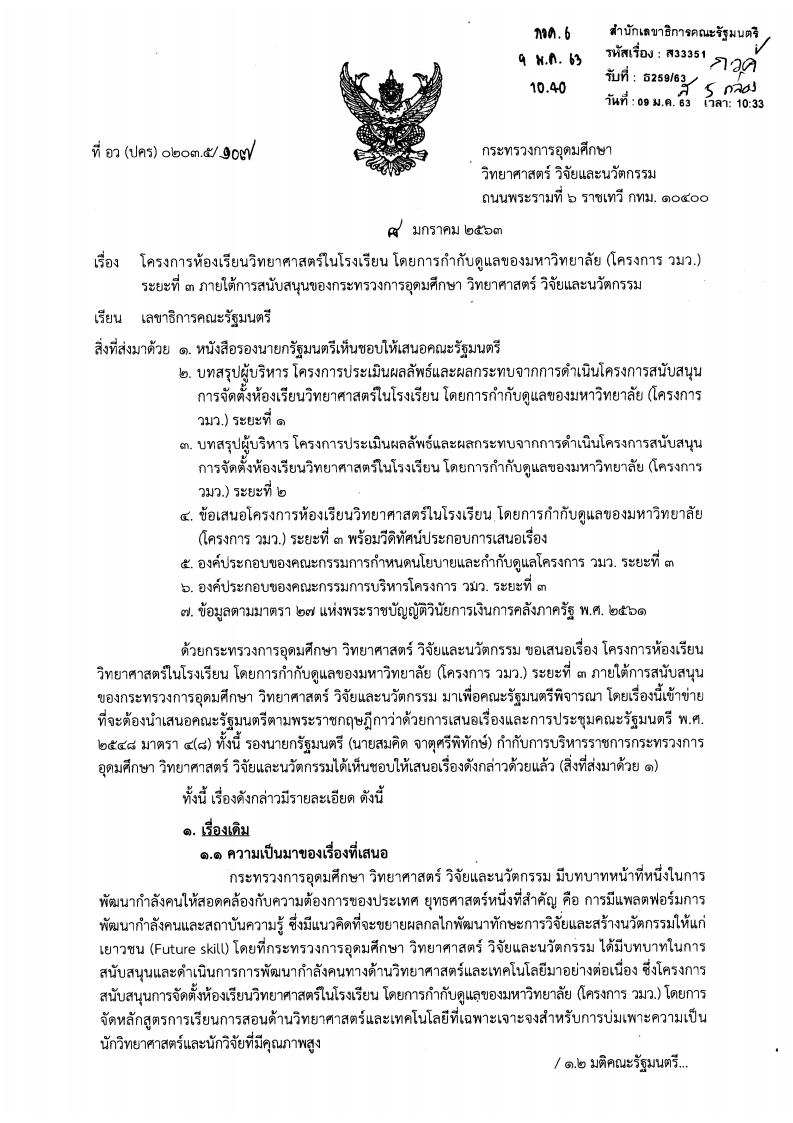 หนังสือราชการที่ อว(ปคร)0203.5/107 ลงวันที่ 8 มกราคม 2563 กล่าวถึง กระทรวงการอุดมศึกษา วิทยาศาสตร์ วิจัยและนวัตกรรม เสนอต่อคณะรัฐมนตรี เกี่ยวกับโครงการห้องเรียนวิทยาศาสตร์ในโรงเรียน โดยการกำกับดูแลของมหาวิทยาลัย (โครงการ วมว.)ระยะที่ 3 ภายใต้การสนับสนุนของกระทรวงการอุดมศึกษา วิทยาศาสตร์ วิจัยและนวัตกรรม โดยคณะรัฐมนตรีมีมติอนุมัติในหลักการของโครงการห้องเรียนวิทยาศาสตร์ในโรงเรียน ในการกำกับดูแลของมหาวิทยาลัย (โครงการ วมว.) ระยะที่ 3 ภายใต้การสนับสนุนของกระทรวงการอุดมศึกษา วิทยาศาสตร์ วิจัยและนวัตกรรม ระยะเวลา 20 ปี (ปีงบประมาณ พ.ศ. 2564-2583) ในกรอบวงเงินงบประมาณรวม 11,943.00 ล้านบาท และเห็นชอบองค์ประกอบของคณะกรรมการระดับนโยบายที่จะทำหน้าที่ในการกำหนดนโยบาย กรอบ และทิศทางการดำเนินงานโครงการ และคณะกรรมการระดับบริหารเพื่อทำหน้าที่กำหนดหลักการ แนวทาง หลักเกณฑ์ การบริหารจัดการ ให้คำแนะนำ ส่งเสริมการดำเนินงานและติดตามผลการดำเนินงานของโครงการในภาพรวม สำหรับวงเงินงบประมาณ จำนวน 11,943.00 ล้านบาท เห็นควรให้หน่วยงานเสนอคำขอตั้งงบประมาณรายจ่ายประจำปีงบประมาณ พ.ศ. 2564 ตามขั้นตอน โดยจัดทำแผนการปฏิบัติงานและแผนการใช้จ่ายงบประมาณ พร้อมรายละเอียดที่เกี่ยวข้องตามความพร้อม ความจำเป็น และความเหมาะสมที่จะต้องใช้จ่ายในแต่ละปีงบประมาณ ให้สอดคล้องกับระยะเวลาตามแผนแม่บทภายใต้ยุทธศาสตร์ ความครอบคลุมของแหล่งงบประมาณ ศักยภาพและความสามารถในการใช้จ่ายงบประมาณในปีที่ผ่านมา เพื่อให้เกิดประสิทธิภาพและความคุ้มค่าในการใช้จ่ายงบประมาณ และเกิดผลสัมฤทธิ์ในการบริหารจัดการภาครัฐ ตามนัยพระราชบัญญัติวิธีการงบประมาณ พ.ศ. 2561 และตามขั้นตอนของการพิจารณาเสนอของบประมาณรายจ่ายประจำปีต่อไป ตามความเห็นของสำนักงบประมาณ