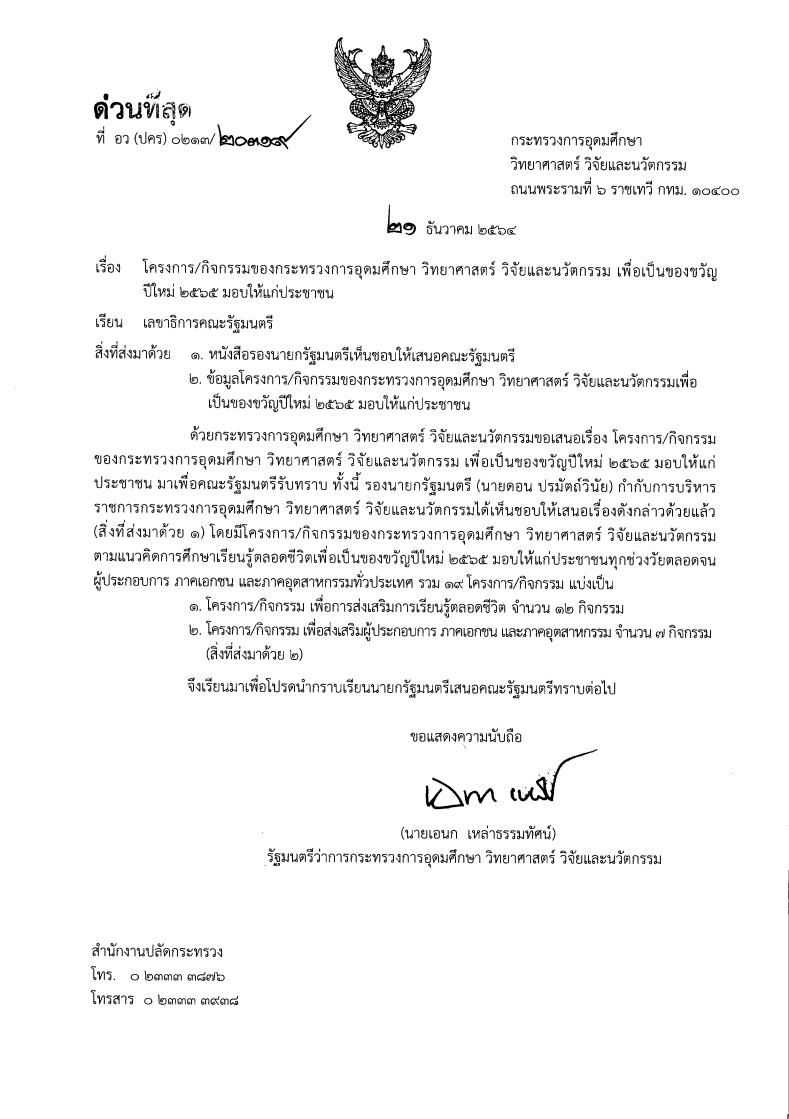 หนังสือราชการที่ อว(ปคร)0213/20319 ลงวันที่ 21 ธันวาคม 2564 กล่าวถึง กระทรวงการอุดมศึกษา วิทยาศาสตร์ วิจัยและนวัตกรรม เสนอต่อคณะรัฐมนตรี เกี่ยวกับโครงการ/กิจกรรมของกระทรวงการอุดมศึกษา วิทยาศาสตร์ วิจัยและนวัตกรรม เพื่อเป็นของขวัญปีใหม่ 2565 มอบให้แก่ประชาชน โดยคณะรัฐมนตรีมีมติรับทราบโครงการ/กิจกรรมของกระทรวงการอุดมศึกษา วิทยาศาสตร์ วิจัยและนวัตกรรม เพื่อมอบเป็นของขวัญปีใหม่ 2565 มอบให้แก่ประชาชน รวม 19 โครงการ/กิจกรรม แบ่งเป็น 1. โครงการ/กิจกรรม เพื่อส่งเสริมการเรียนรู้ตลอดชีวิต จำนวน 12 กิจกรรม 2. โครงการ/กิจกรรม เพื่อส่งเสริมผู้ประกอบการ ภาคเอกชน และภาคอุตสาหกรรม จำนวน 7 กิจกรรม ตามที่กระทรวงการอุดมศึกษา วิทยาศาสตร์ วิจัยและนวัตกรรมเสนอ