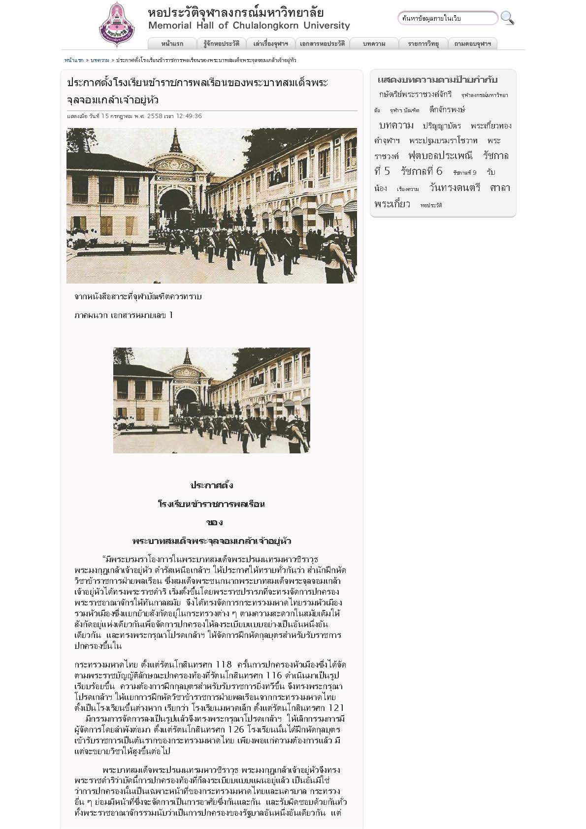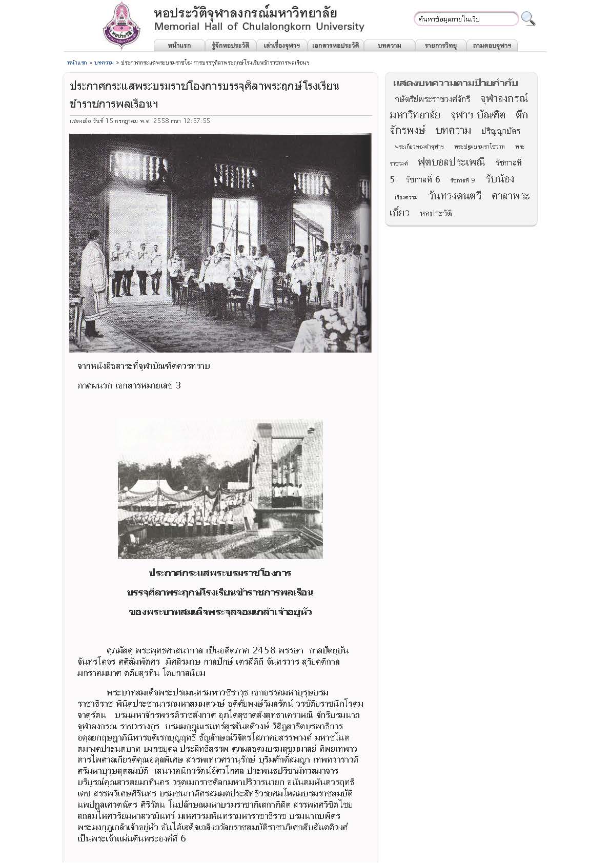 ศุภมัสดุ พระพุทธศาสนากาล เป็นอดีตภาค 2458 พรรษา กาลปัตยุบัน จันทรโคจร ศศิสัมพัตศร มิศสิรมาษ กาลปักษ์ เตรสีดิถี จันทรวาร สุริยคติกาล มกราคมมาศ ตติยสุรทิน โดยกาลนิยม พระบาทสมเด็จพระปรเมนทรมหาวชิราวุธ เอกอรรคมหาบุรุษบรมราชาธิราช พินิตประชานารถมหาสมมตวงษ์ อดิศัยพงษ์วิมลรัตน์ วรขัติยราชนิกโรดม จาตุรัตน บรมมหาจักรพรรดิราชสังกาศ อุภโตสุชาตสังสุทธาเคราหณี จักรีบรมนาถจุฬาลงกรณ ราชวรางกูร บรมมกุฎนเรนทร์สูรสันตติวงษ์ วิสิฏสาธิตบุรพาธิการ อดุลยกฤษฎาภินิหารอดิเรกบุญฤทธิ์ ธัญลักษณ์วิจิตรโสภาคยสรรพางค์ มหาชโนตตมางคประนตบาท บงกชยุคล ประสิทธิสรรพ ศุภผลอุดมบรมสุขุมมาลย์ ทิพยเทพาวตารไพศาลเกียรติคุณอดุลพิเศษ สรรพเทเวศรานุรักษ์ บุริมศักดิ์สมญา เทพทวาราวดีศรีมหาบุรุษสุตสมบัติ เสนางคนิกรรัตน์อัศวโกศล ประพนธปรีชามัทวสมาจาร บริบูรณ์คุณสารสยมาทินคร วรุตเมกราชดิลกมหาปริวารนายก อนันตมหันตวรฤทธิเดช สรรพวิเศษศิรินทร บรมชนกาดิศรสมมตประสิทธิวรยศมโหดมบรมราชสมบัติ นพปฎลเศวตฉัตร ศิริรัตน โนปลักษณมหาบรมราชาภิเสกาภิสิต สรรพทศวิชิตไชย สถลมไหศวริยมหาสวามินทร์ มเหศวรมหินทรามหาราชาธิราช บรมนาถบพิตร พระมงกุฎเกล้าเจ้าอยู่หัว อันได้เสด็จเถลิงถวัลยราชสมบัติราชาภิเศกสืบสันตติวงศ์ เป็นพระเจ้าแผ่นดินพระองค์ที่ 6 ในมหาจักรีพระบรมราชวงศ์ ซึ่งได้ประดิษฐาน และดำรงกรุงเทพมหานครอมรรัตนโกสินทร์มหินทรายุธยามหาดิลกภพนพรัตน์ราชธานีบุรีรมย์ อุดมราชนิเวศน์มหาสถาน อันเป็นบรมราชธานีใหญ่ในประเทศสยามทั้งฝ่ายเหนือและฝ่ายใต้ และมลาวประเทศ มลายูประเทศ ทรงพระอนุสรณ์ คำนึงถึงโรงเรียนมหาดเล็ก ซึ่งสมเด็จพระบรมชนกาธิราชได้ทรงสถาปนาขึ้นไว้ เพื่อเป็นที่ฝึกหัดนักเรียนมหาดเล็กในวิชารัฐประศาสน์สำหรับออกรับราชการสนองพระเดชพระคุณ ในกระทรวงมหาดไทย เป็นอาทิ ว่าถึงเวลาแล้วที่จะขยายการโรงเรียนให้กว้างขวางออกไป สำหรับฝึกหัดมหาดเล็กให้เข้ารับราชการได้ทุกกระทรวงทบวงการจัดการโรงเรียนให้เป็นแผนกวิทยาต่าง ๆ เช่น รัฏประศาสน์ กฎหมาย การต่างประเทศ การเกษตร การช่าง การแพทย์ ครู เป็นต้น เพื่อจะได้เป็นมหาวิทยาลัยสง่าพระนครต่อไป จึงทรงพระกรุณาโปรดเกล้าฯ ให้สถาปนาโรงเรียนมหาดเล็กเดิมขึ้นเป็นโรงเรียนชั้นอุดมศึกษา พระราชทานนามว่าโรงเรียนข้าราชการพลเรือนของพระบาทสมเด็จพระจุลจอมเกล้าเจ้าอยู่หัว เฉลิมพระบรมนามาภิธัยในสมเด็จพระบรมชนกาธิราชเจ้า เป็นการสนองพระเดชพระคุณให้สมพระบรมราชประสงค์ ดังที่ได้ทรงตั้งพระราชหฤทัยไว้แล้ว -