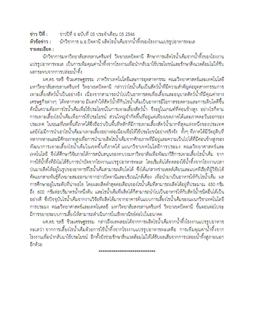 ข่าวปีที่ 6 ฉบับที่ 05 ประจำเดือน 05 พ.ศ. 2546 เกี่ยวกับผลงานของนักวิชาการ ม.อ.ปัตตานี ผลิตไรน้ำเค็มจากน้ำทิ้งของโรงงานแปรรูปอาหารทะเล ซึ่งผลพลอยได้จากการผลิตไรน้ำเค็มจากน้ำทิ้งโรงงานแปรรูปอาหารทะเลว่า จากการเลี้ยงไรน้ำเค็มด้วยการใช้น้ำทิ้งจากโรงงานแปรรูปอาหารทะเลคือ การเพิ่มคุณค่าน้ำทิ้งจากโรงงานเพื่อนำกลับมาใช้ประโยชน์ อีกทั้งยังช่วยรักษาสิ่งแวดล้อมไม่ให้ได้รับผลเสียจากการปล่อยน้ำทิ้งสู่ภายนอก